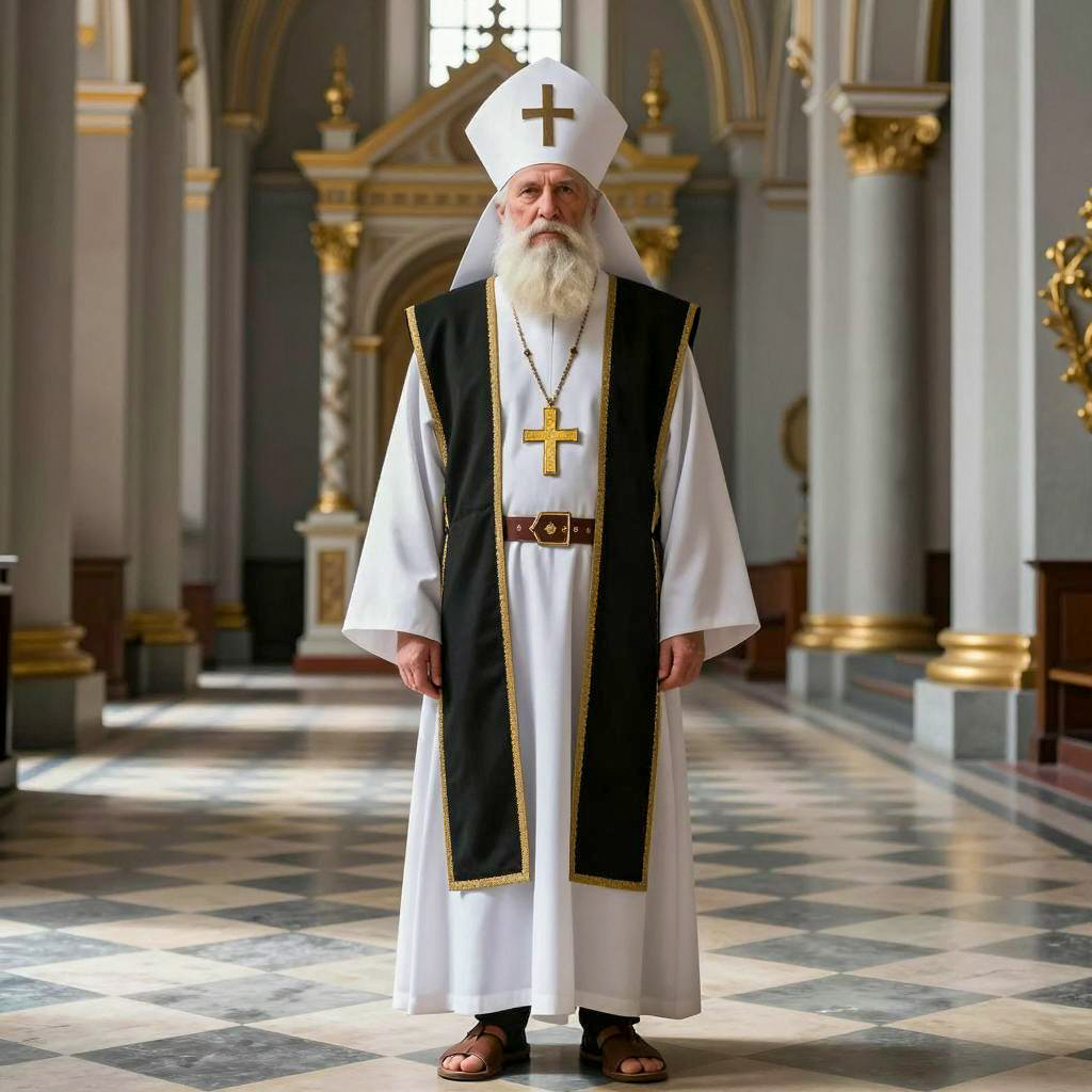 Medieval priest costume, photorealistic, elderly man, long white beard, wearing traditional Orthodox bishop's attire, white robe, black vest, white hat with cross, large gold cross necklace, brown belt, brown sandals, standing in ornate cathedral hallway, checkered floor, tall columns, sunlight from windows, serious expression, centered in image, symmetrical background, realistic lighting, detailed ures, traditional religious clothing, church interior, full body shot