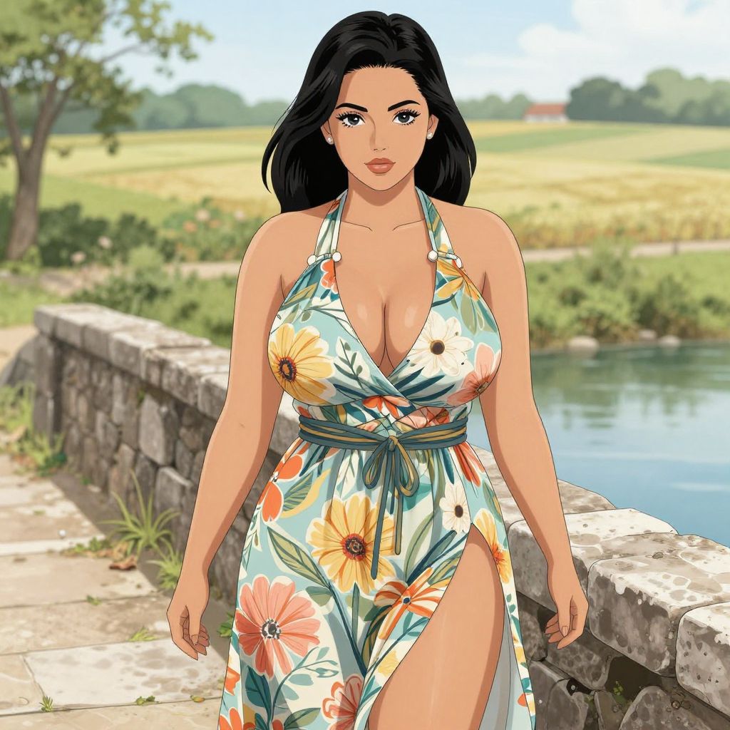 Digital illustration of a curvy woman with black hair, large breasts, wearing a floral halter dress with a high slit, standing by a stone bridge