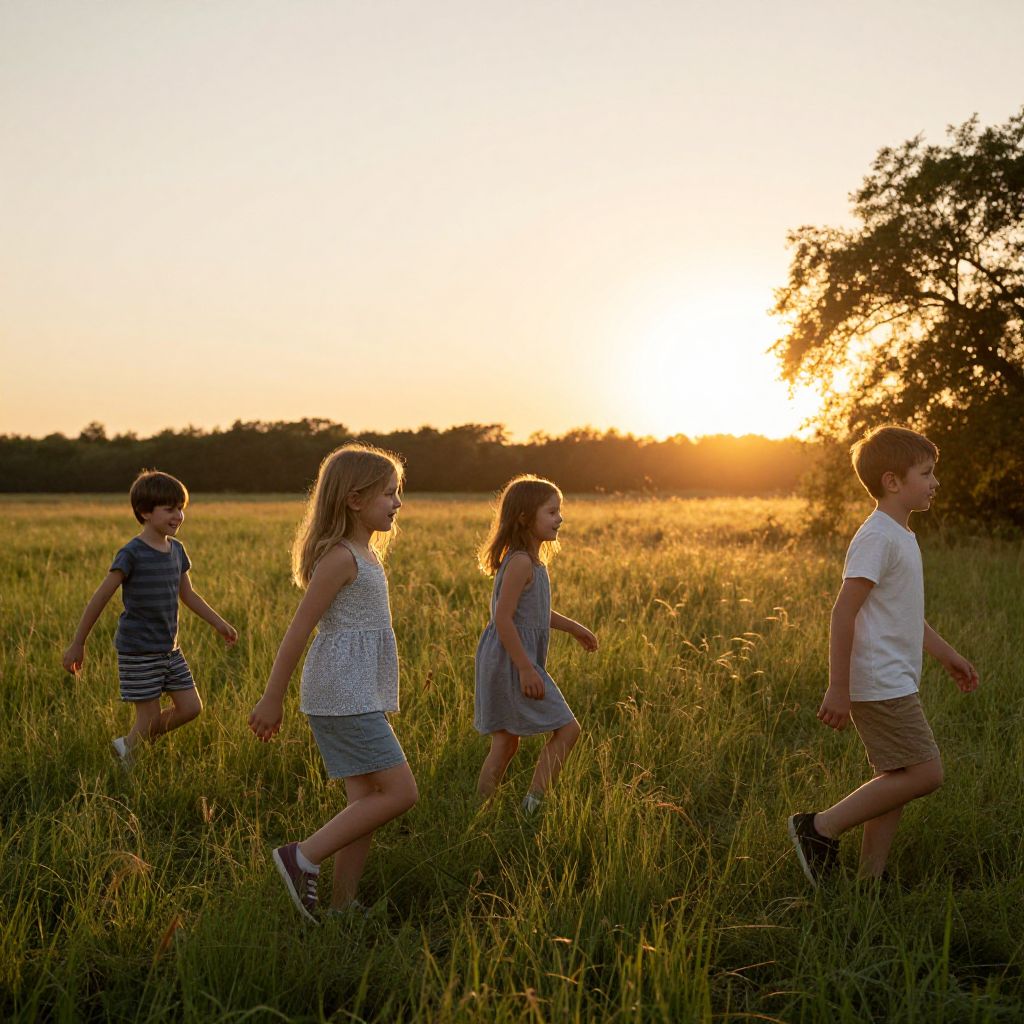 Threads of golden light weave through the air as children, bathed in the warmth of twilight, traverse a meadow alive with whispers of summer, their laughter echoing like a symphony of innocence amidst the timeless dance of nature.