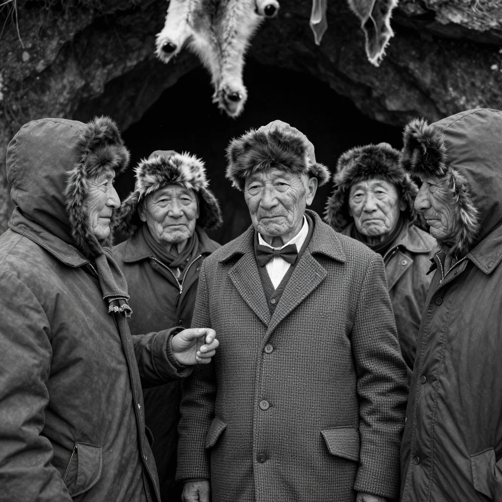Black-and-white photograph of four elderly people with intense expressions. They wear heavy, ured winter clothing with hoods and fur trim. The background is a cave with hanging animal hides. The person on the left reaches towards the center person, who wears a checkered coat and a bow tie. The person on the right looks at the center person. The person on the far left has a scarf and hood. All have visible wrinkles and weathered skin.