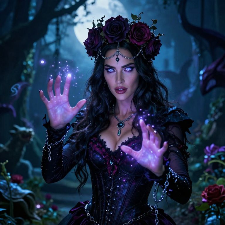 Megan Fox witch in a moonlit enchanted garden, her eyes glowing with supernatural power, wearing a crown of dark roses and silver chains, casting a spell with her hands amid sparkling magical orbs, shadows of mythical creatures lurking nearby --v 4 --ar 16:9