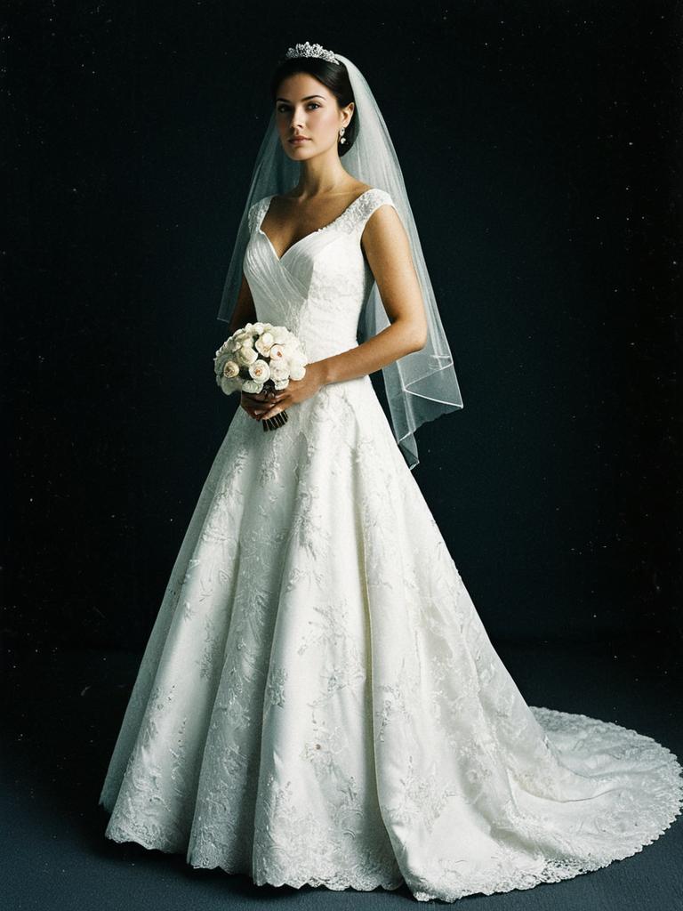 Full-body portrait of a young woman in an elegant white wedding dress with lace detailing, wearing a tiara and long veil, holding a bouquet of white flowers, standing against a dark background.