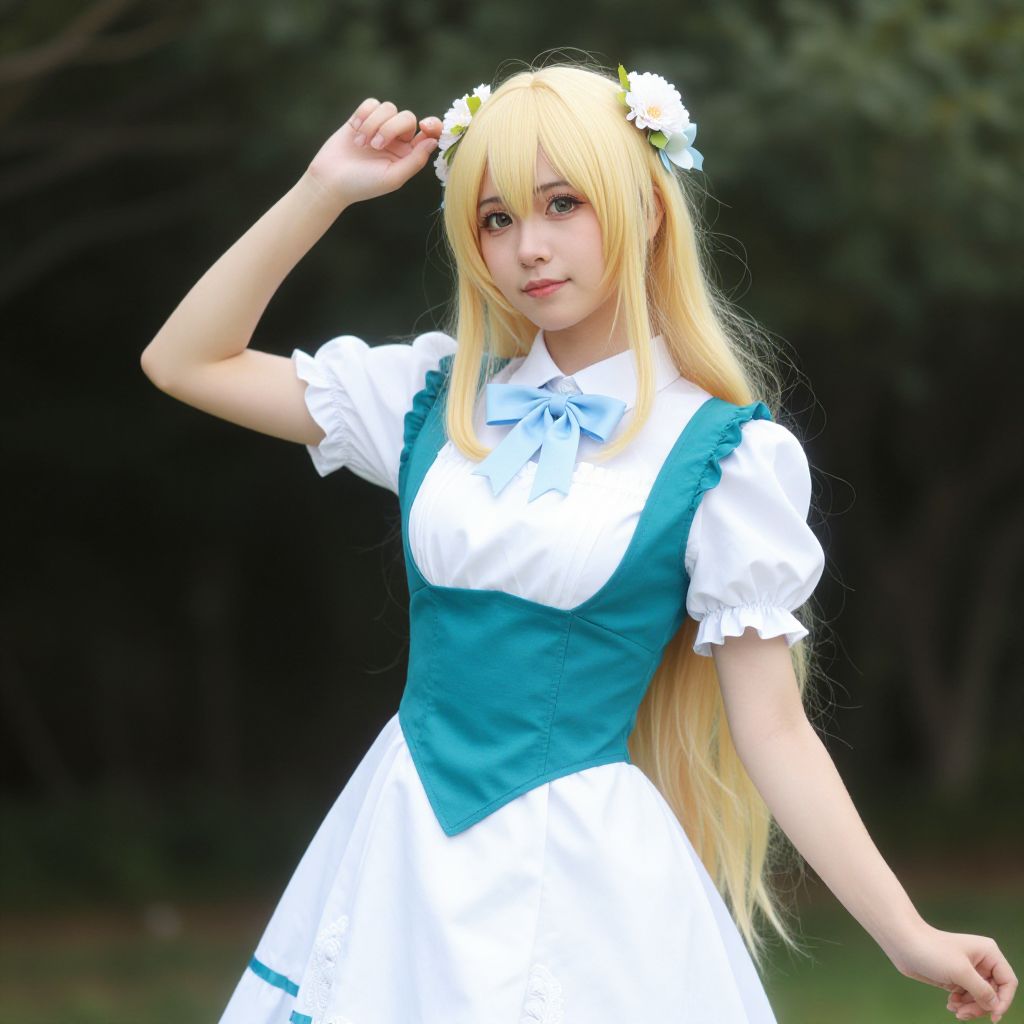 A photograph of a young woman with long, straight blonde hair adorned with white flowers, cosplaying as a character in a teal and white dress. She has fair skin, large brown eyes, and a slight smile. Her dress features puffed short sleeves, a white collar, and a teal bodice with a white apron. She raises her right hand to touch her hair. The background is a blurred, dark green forest, creating a natural contrast to her bright costume. The image has a soft, slightly overexposed look, emphasizing her hair and dress.