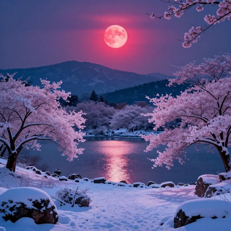 A surreal digital artwork depicts a dreamlike landscape where cherry blossom trees, bathed in the ethereal glow of a crimson sunset, bear crystalline leaves that shimmer like captured starlight, creating a magical and otherworldly atmosphere.