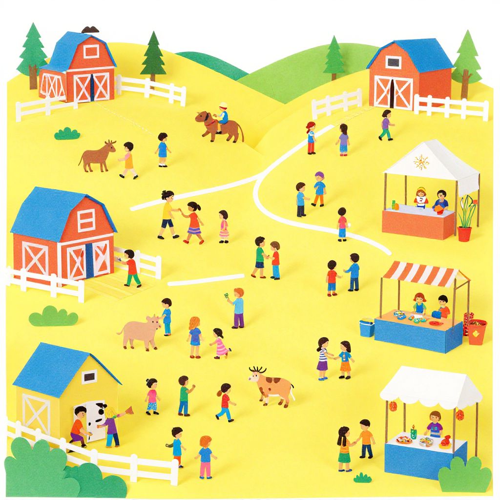Colorful digital illustration of a bustling farmyard with red barns, various animals, children, and market stalls on a sunny yellow field.