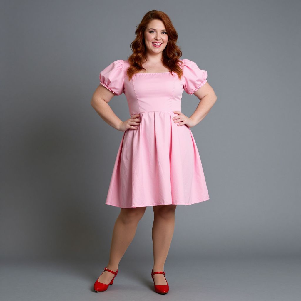Plus Size Grease Costume, woman in a pink dress and red shoes posing for a picture