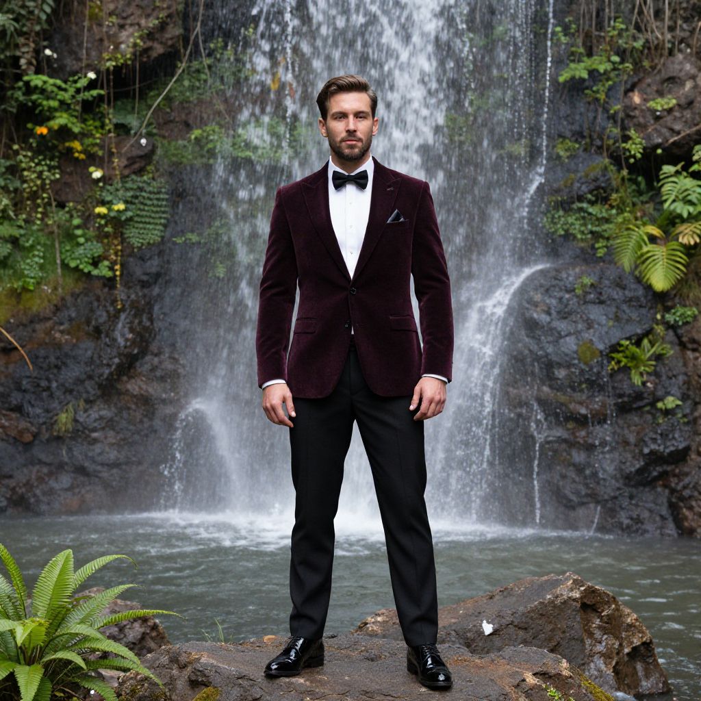 A photograph of a handsome man standing in front of a cascading waterfall surrounded by lush greenery. He's wearing a dark burgundy velvet blazer with a black bow tie, white dress shirt, and black trousers. His black shoes are polished, and he has a pocket square in the blazer's breast pocket. The background features large rocks and various tropical plants, creating a vibrant, natural setting.