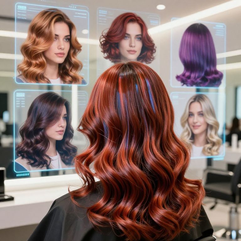 Virtual hair color tester, futuristic hologram projection of various hair colors surrounding a person's head in a high-tech beauty salon, rich saturation, dynamic lighting, digital brush strokes blending smoothly into real hair, hyperrealistic style