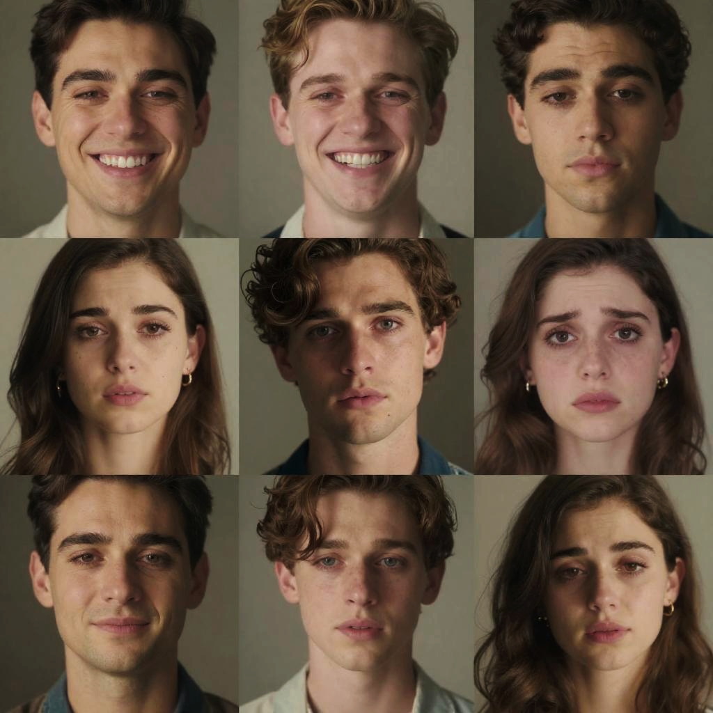 Portraits of actors in character, showcasing a range of emotions from joy to sorrow, detailed facial expressions, high resolution textures, stylized backgrounds that evoke the story genres they represent, cinematic color grading enhancing mood and story depth.