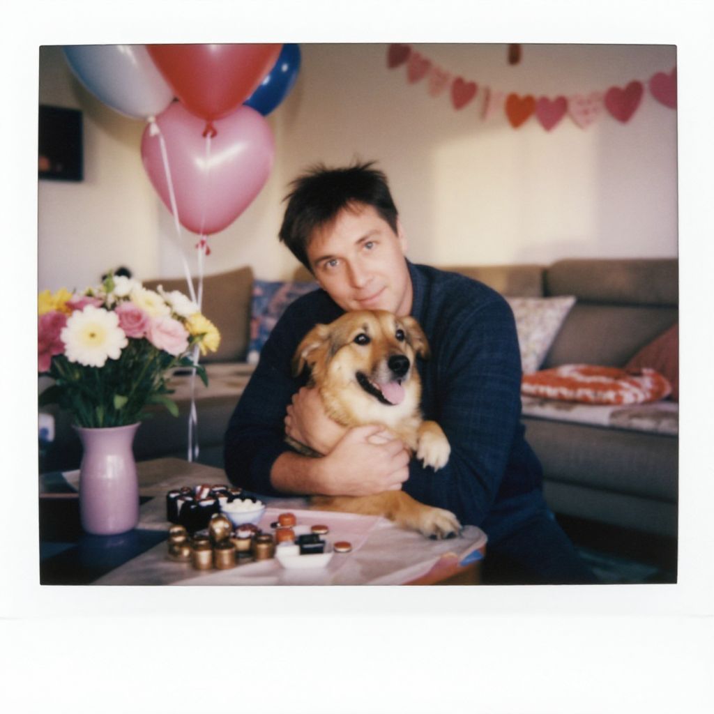 Heartwarming moment: A man, surrounded by flowers, chocolates, and balloons, shares a tender hug with his loyal canine companion on Happy Valentine's Day. Soft, golden hour lighting illuminates their joyful faces, set against a cozy living room backdrop adorned with romantic decorations. Faded Polaroid filter effect adds nostalgic charm to this intimate, candid snapshot Man has masculine face and piercing eyes