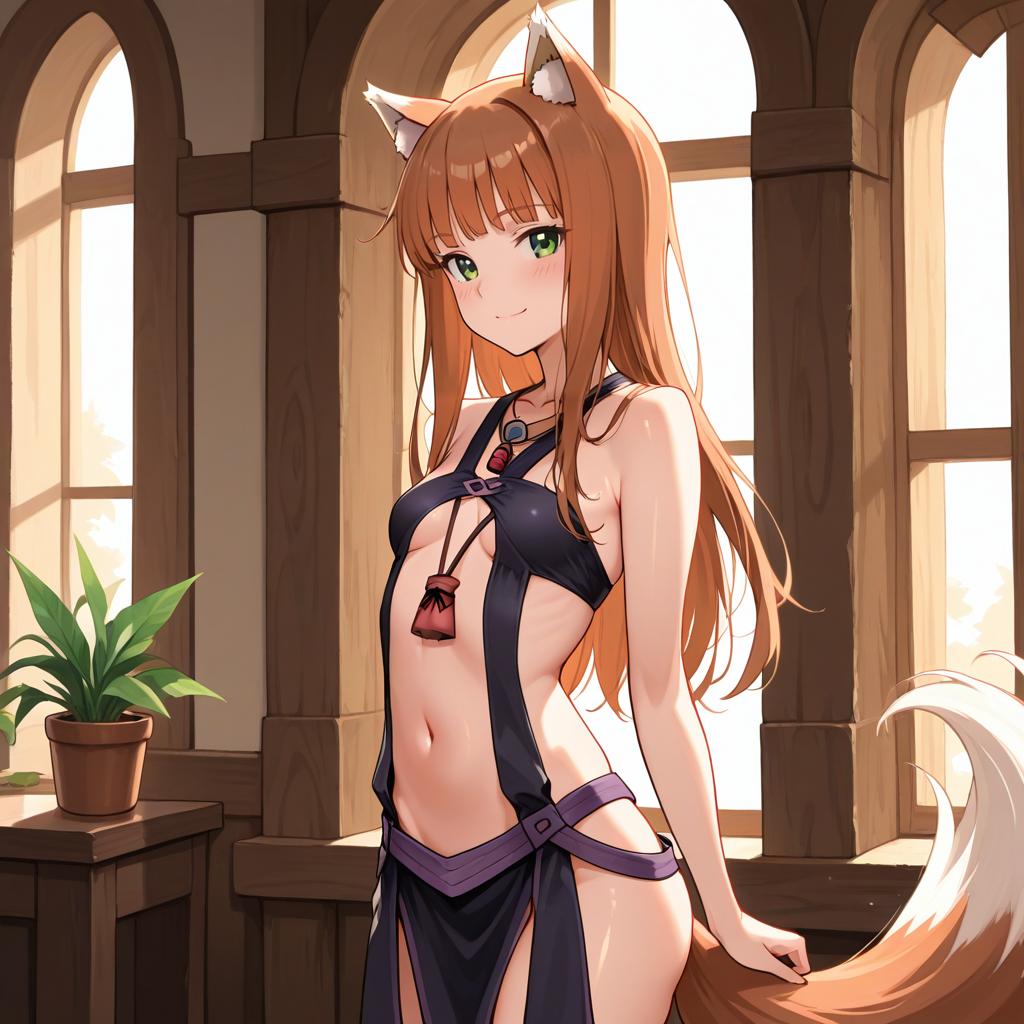 Best quality, indoors, window, potted plant, 1girl, holo, (spice and wolf:0.9), small breasts, slender, blunt bangs, long hair, animal ears, npmaybe, probably no panties, revealing cosplay