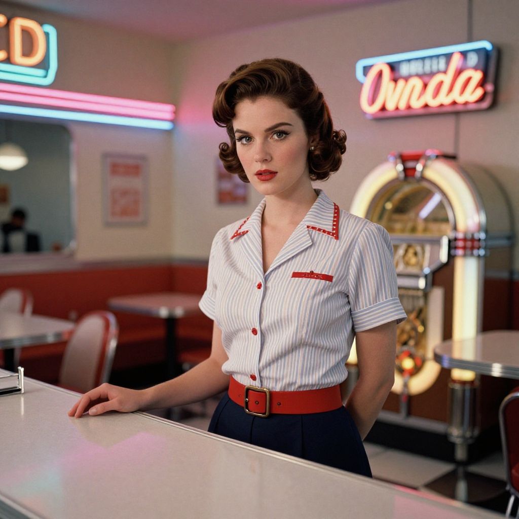 Photograph of a Caucasian woman with fair skin and dark brown hair styled in vintage waves, wearing a blue-gray, short-sleeved, button-up shirt with a white collar and a "Daisy" name tag. She also has on a matching blue-gray skirt that is form-fitting, and a blue headband. She stands confidently with hands on hips, lips painted bright red, and red lipstick matching her nails. The background is a nighttime urban setting with blurred neon signs and bright lights, creating a dramatic, retro atmosphere. The image has a vibrant, cinematic quality, emphasizing her poised and stylish appearance.