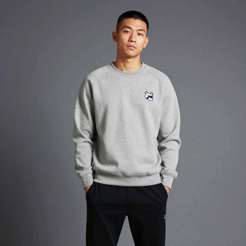 Portrait of an Asian young man standing with hands in pockets, wearing a grey sweatshirt with a small bear logo and black pants, posing against a plain grey background.