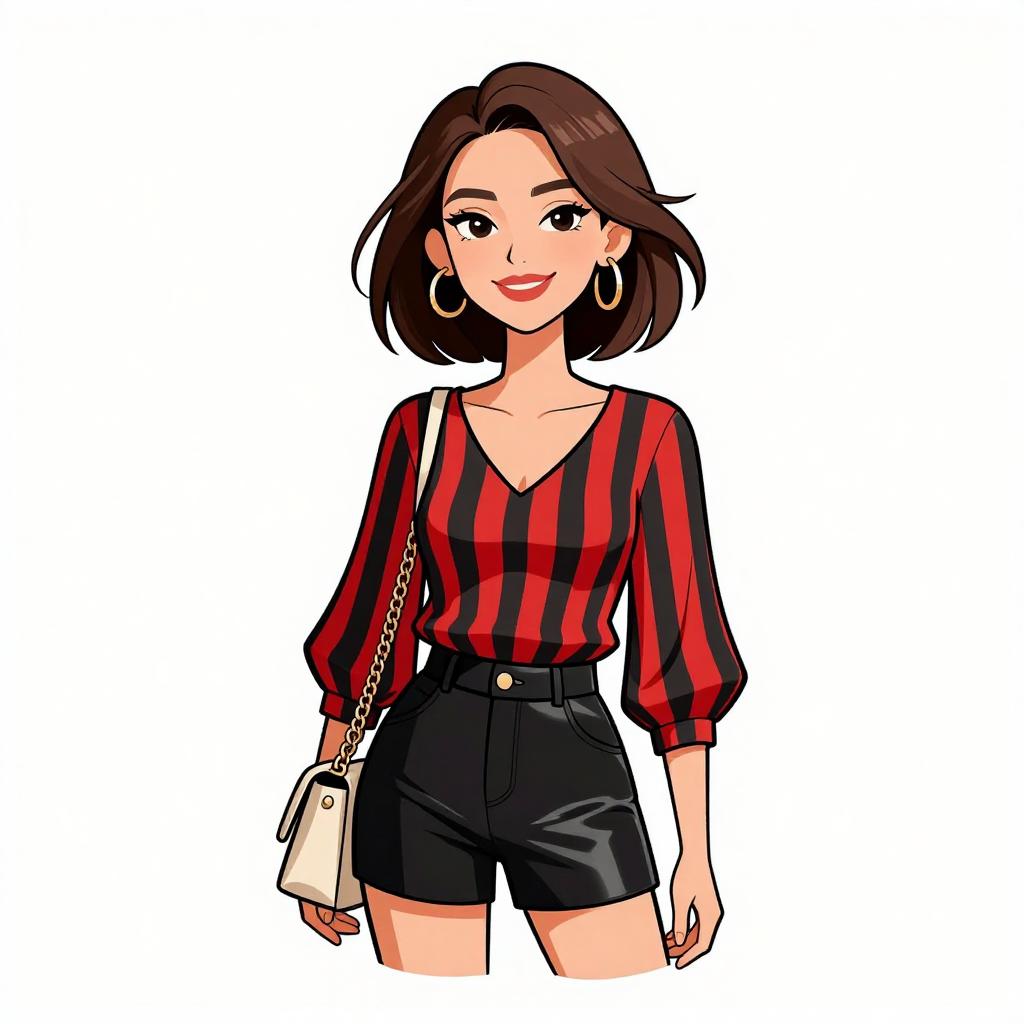Digital illustration of a stylish woman with light skin and dark brown, shoulder-length hair. She wears a red and black vertically striped blouse with puffed sleeves, and high-waisted black shorts with gold buttons. She has large hoop earrings and a confident smile. She carries a small white handbag with a gold chain strap on her right shoulder. The background is plain white, making her the focal point. Her makeup includes red lipstick and subtle eye makeup. The art style is modern and colorful, with clean lines and a slightly cartoonish appearance.