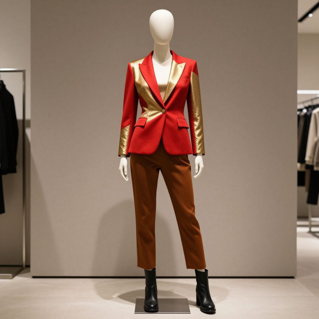 A mannequin wearing a red and gold outfit with brown pants and black boots, standing in a modern, minimalist store setting, with a sleek, neutral background to highlight the vibrant colors of the outfit. The mannequin is posed in a confident, stylish manner, emphasizing the bold color scheme and the elegant yet edgy aesthetic of the outfit. The lighting is soft and even, creating a clean, professional look that showcases the details of the clothing and the mannequin's form. The overall scene is designed to evoke a sense of sophistication and high fashion.