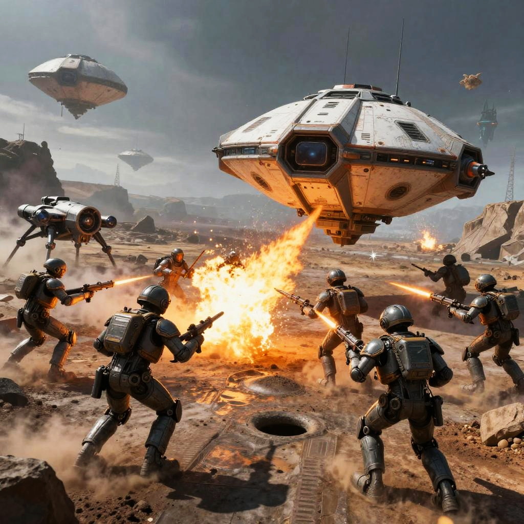 Devastators Helldivers 2 squad deploying from a drop pod onto a hostile planet, heavy fire exchange, mechanized drones assisting, rugged terrain with craters and smoke, science fiction style, epic scale, vibrant yet gritty colors