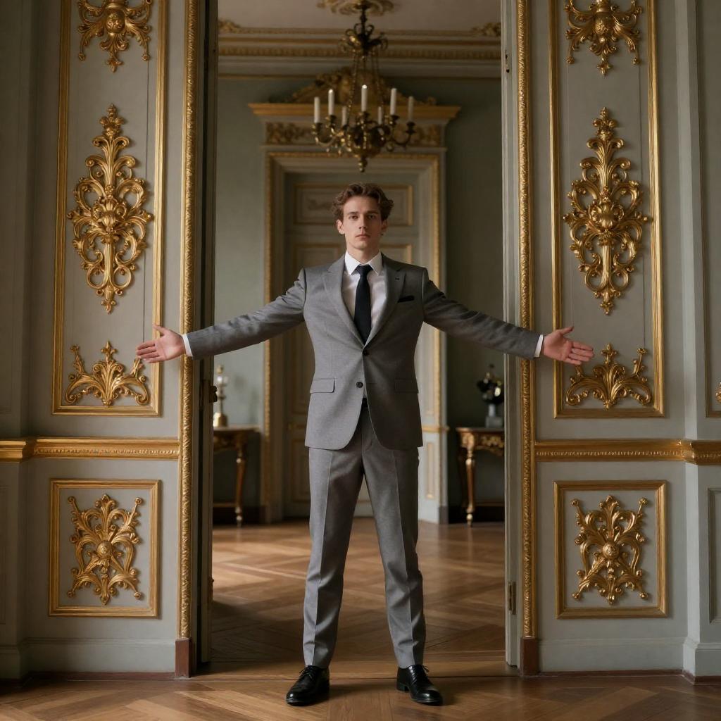 Man in grey suit with arms outstretched, standing in ornate doorway. Gold, intricate carvings on door panels. Elegant, dimly lit interior in background. Wooden floor, chandelier, furniture. Man centered, symmetrical composition. Confident, commanding pose. Classic, luxurious setting.