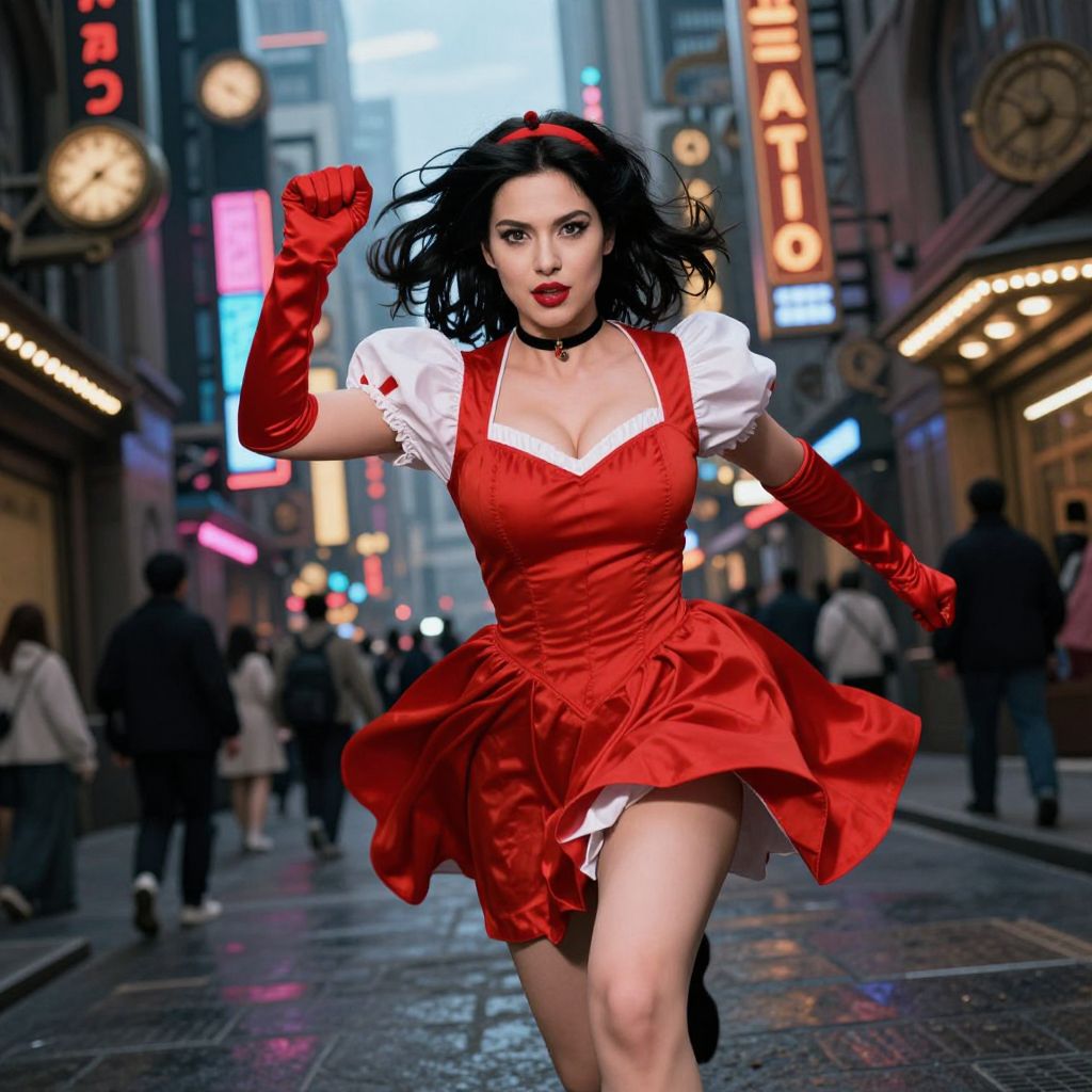 Photorealistic digital artwork of a woman with pale skin and dark, wavy hair, wearing a red, low-cut, puffed-sleeve dress with a white blouse underneath, and red satin gloves. She has red lipstick and a red headband. She's running through a neon-lit, rainy city street at night, with blurred pedestrians in the background. Bright, colorful signs, including one with "DATING" in red, illuminate the scene. Her expression is intense, and her dress flares out dramatically as she runs. The street is wet, reflecting the neon lights.