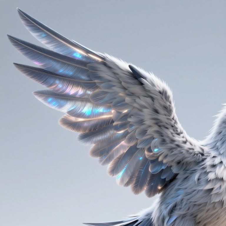 Digital art of a glowing, feathered wing with iridescent blue and white feathers, illuminated by soft light against a pale sky background.