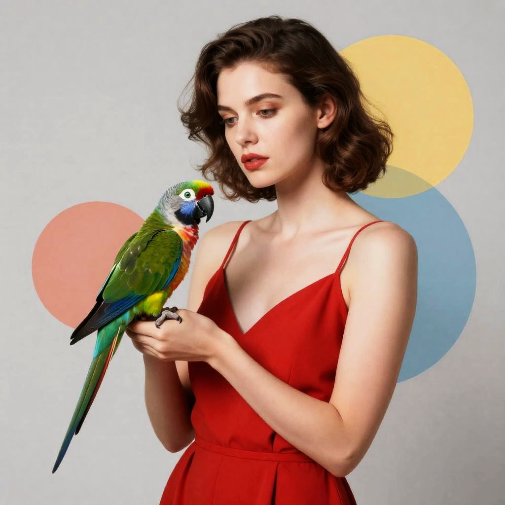 Photograph of a fair-skinned woman with short, wavy brown hair, wearing a red sleeveless dress with a deep V-neck. She holds a vibrant green and blue parrot with a red and yellow beak and chest, looking down at it. The background features large, overlapping colored circles in yellow, blue, and pink. The woman's expression is calm and focused. The image has a clean, minimalistic style with sharp contrasts and bright colors, emphasizing the parrot's vivid plumage and the woman's red dress. The overall aesthetic is modern and elegant.