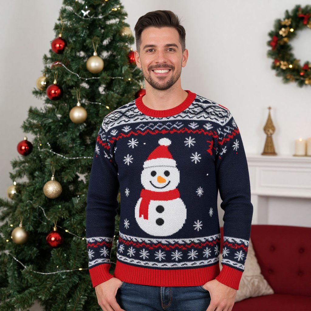 Photograph of a smiling, bearded man with short, dark hair wearing a navy blue Christmas sweater featuring a large white snowman with a red hat and red scarf in the center. The sweater also has red, white, and black snowflake and pattern designs. He stands in front of a decorated Christmas tree with red and gold ornaments, and a white mantel with a small, gold Christmas tree and a red cushion. The background is a bright, white-walled living room.