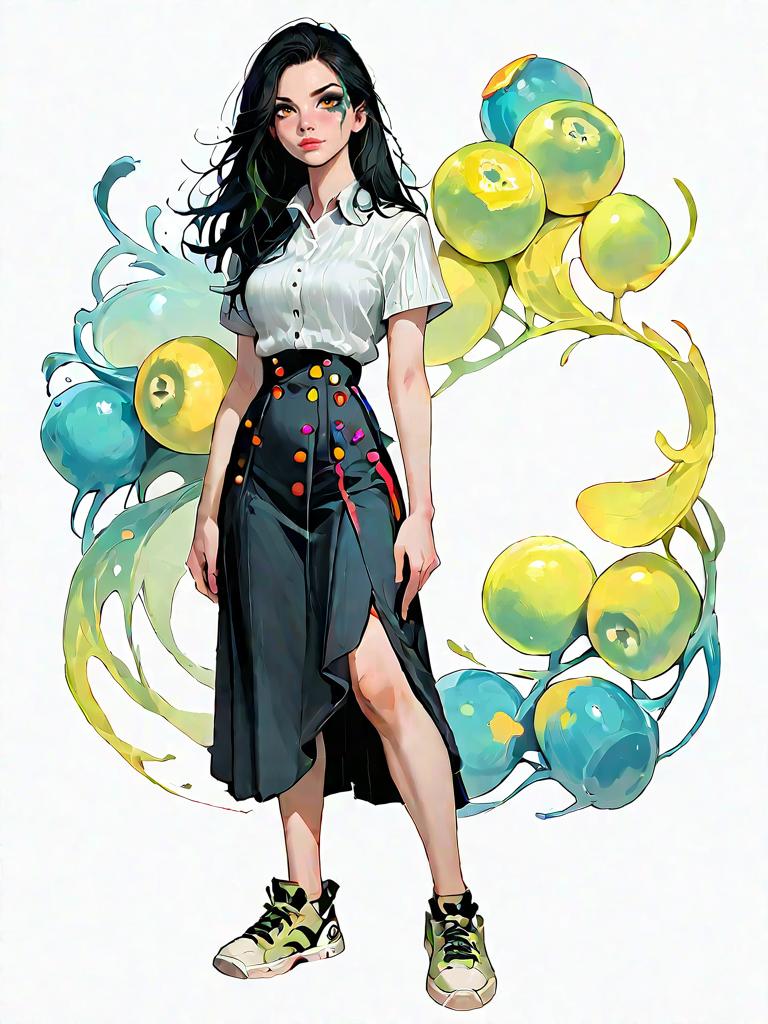 1girl, source_comics, realistic face, full body shot, Woman, casual chic, ribbed two-piece set in lime green, short sleeve crop top with a collared neckline and button-up front, matching high-waist midi skirt with front button detailing and thigh-high slit, white low-top sneakers, minimal makeup, loose hair, plain white studio background.