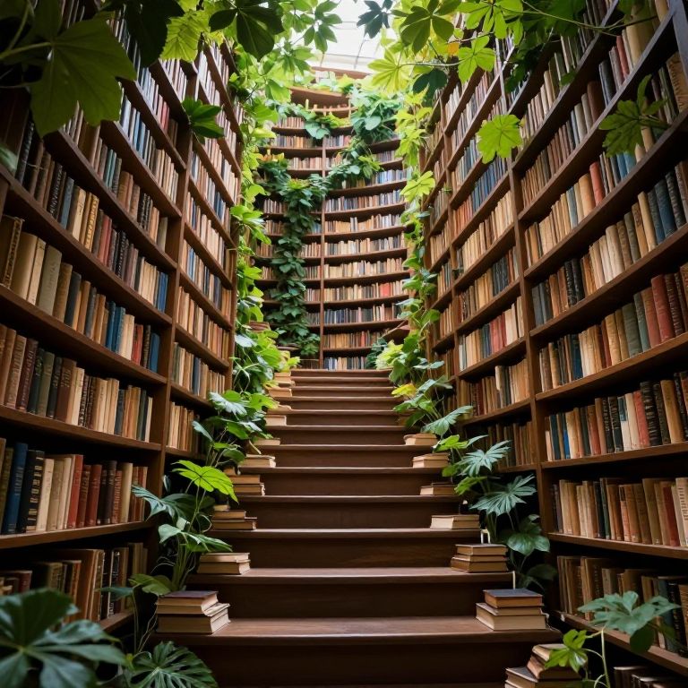 Photograph of a narrow library hallway with tall, wooden bookshelves filled with colorful books on both sides. A central staircase with wooden steps ascends between the shelves, adorned with green ivy climbing up the walls and trailing over the steps. Bright green leaves from overhead plants frame the top of the image, contrasting with the darker wood of the shelves and steps. The sunlight filters through the leaves, casting a natural light on the books and creating a serene, inviting atmosphere. The image has a slightly surreal, almost fantasy-like quality due to the lush greenery in a typically indoor setting.