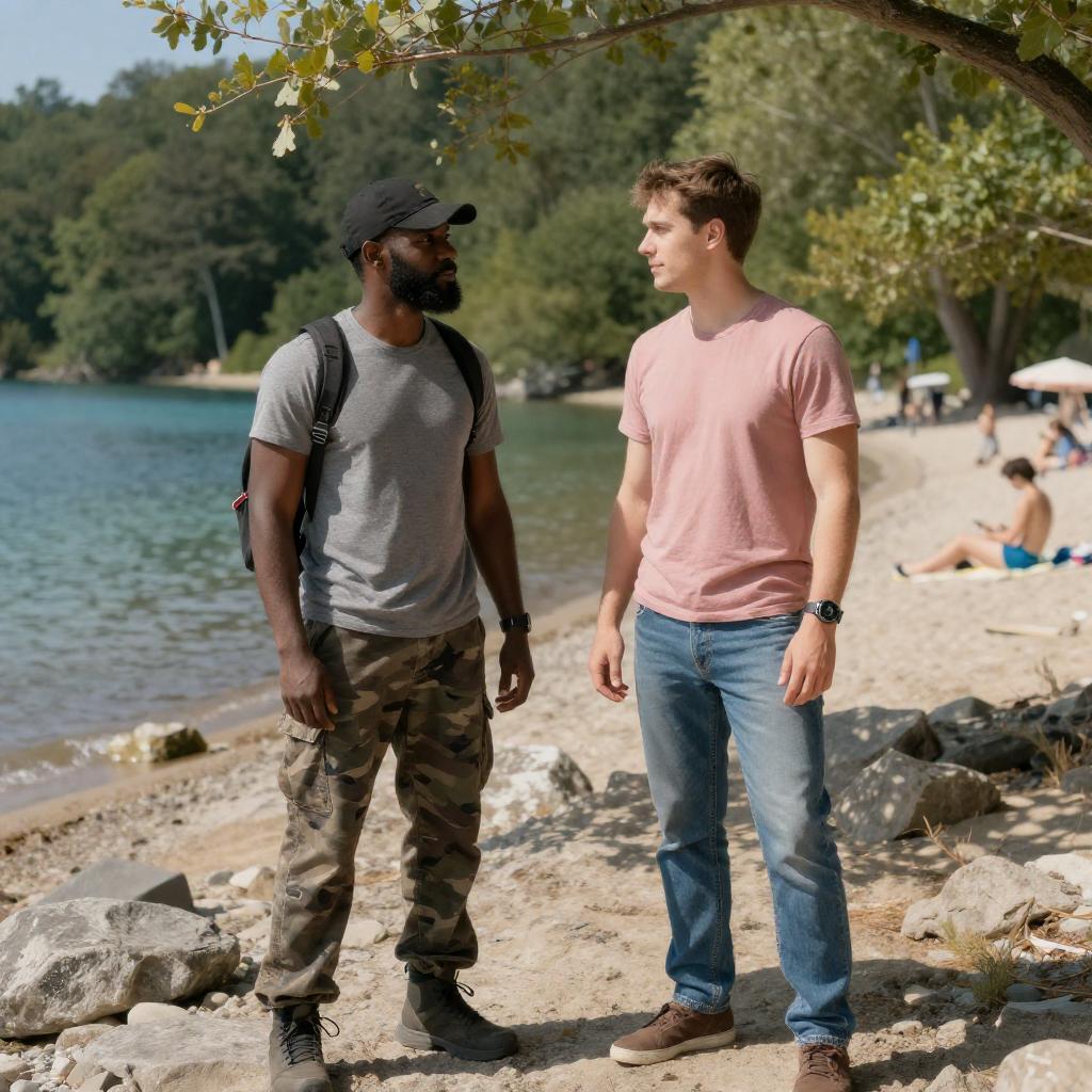 Photograph of two men standing on a rocky beach. The man on the left has dark skin, beard, wears a gray T-shirt, camo pants, black cap, and backpack. The man on the right has light skin, short brown hair, wears a pink T-shirt and blue jeans. Both look at each other. Background includes a turquoise lake, green trees, and a few sunbathers on the beach. Sparse green leaves on trees frame the scene.
