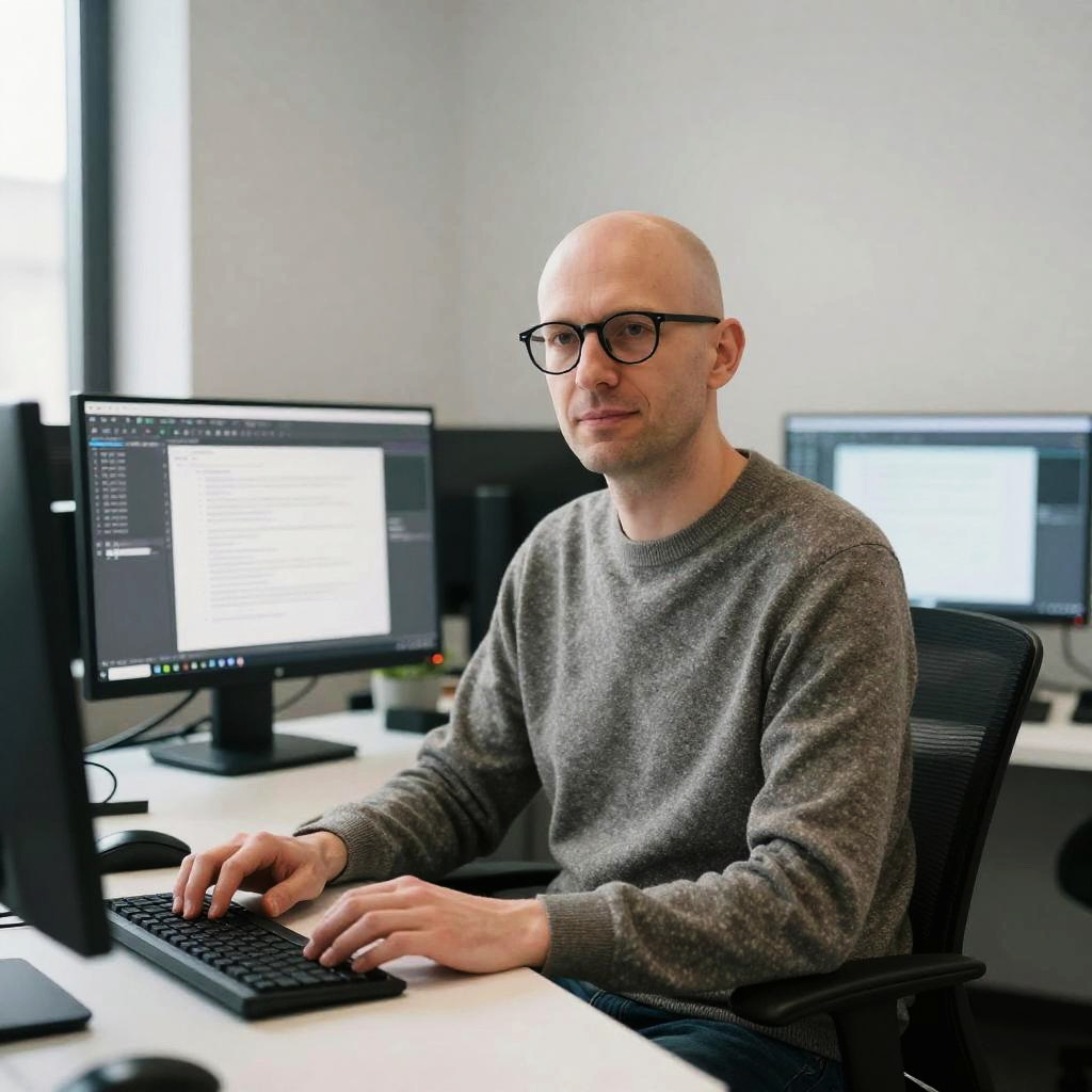 Portrait of a bald editor in a modern minimalist office, wearing glasses and a sweater, surrounded by multiple computer screens displaying text editing software, with a calm and thoughtful expression, soft natural lighting and clean lines