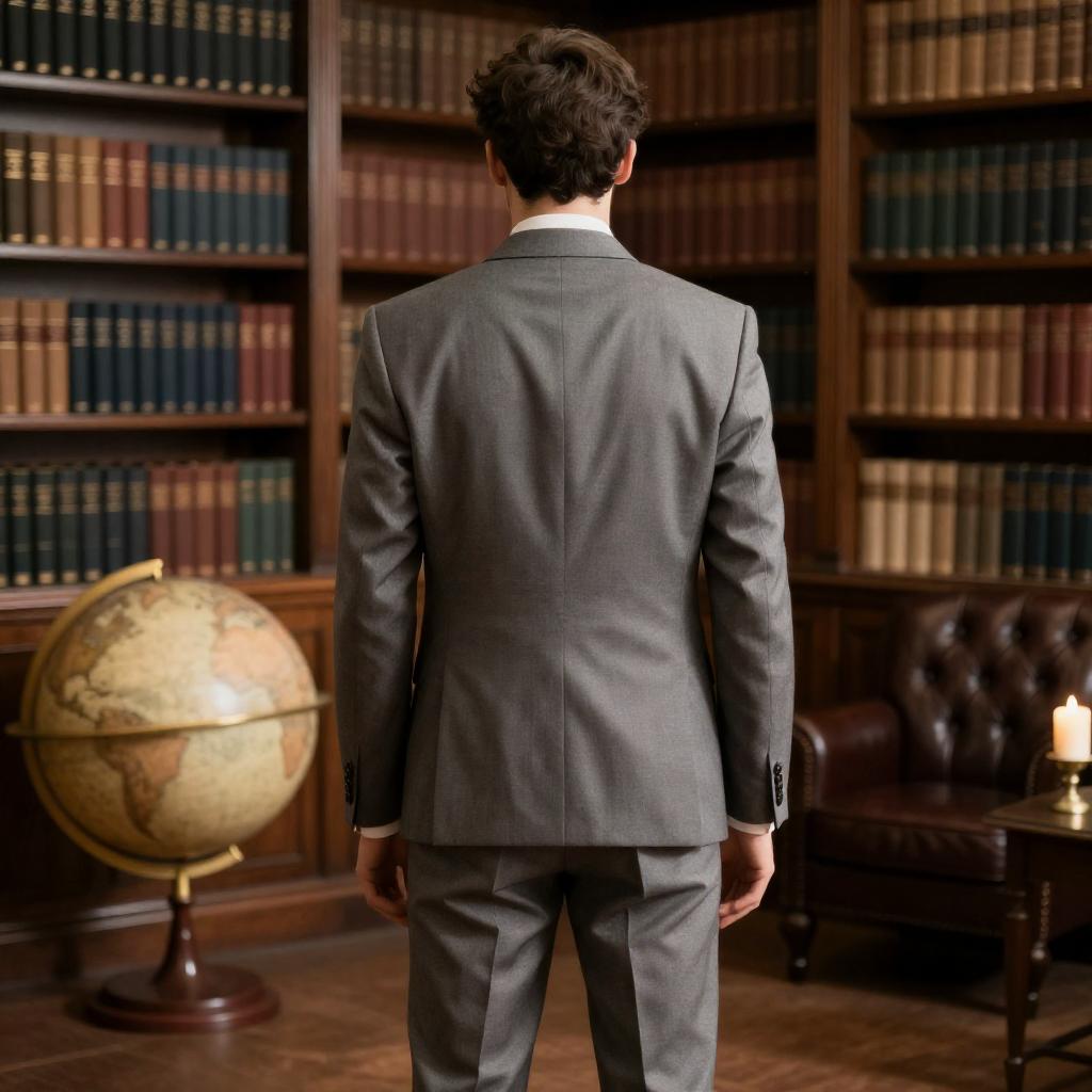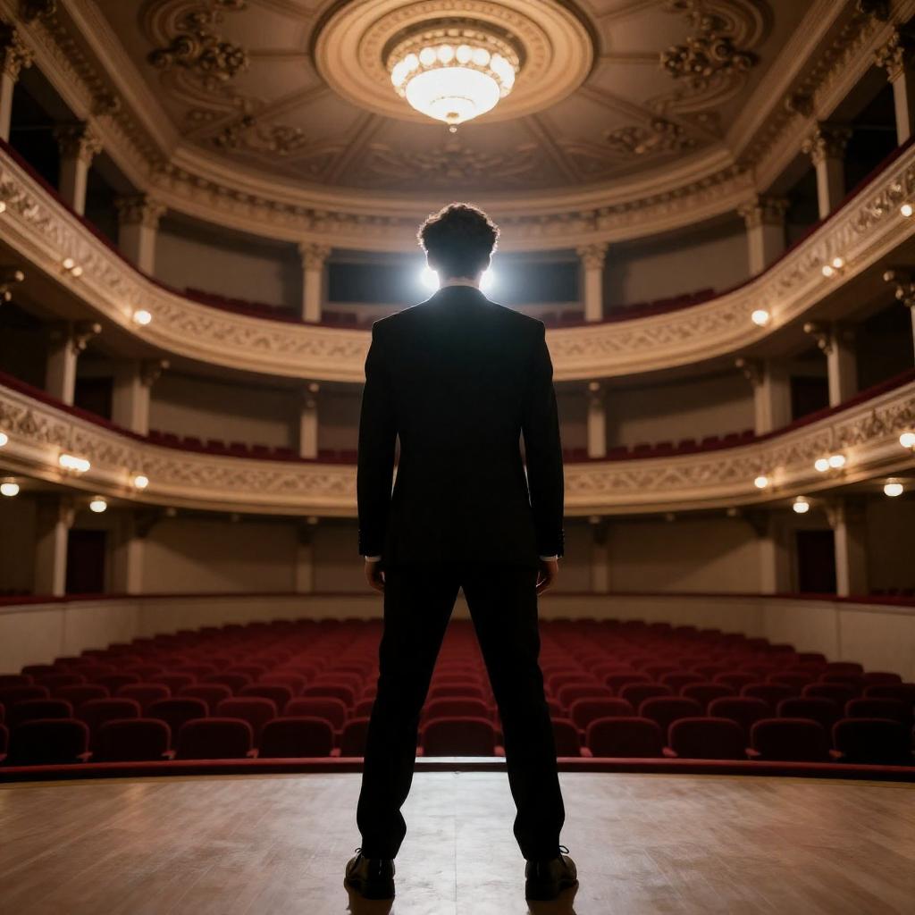 Silhouetted man in black suit stands in center of grand, empty theater with red seats and ornate ceiling. Bright light behind his head, creating halo effect. Classical architecture, symmetrical design. Man's posture is upright, hands by sides.