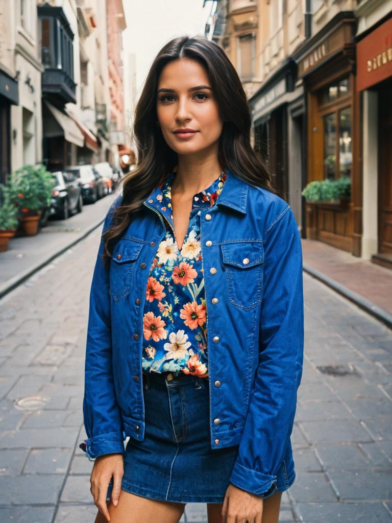 Premium Clothing Brands, woman in a blue jacket and floral shirt standing in a street --sref 1388