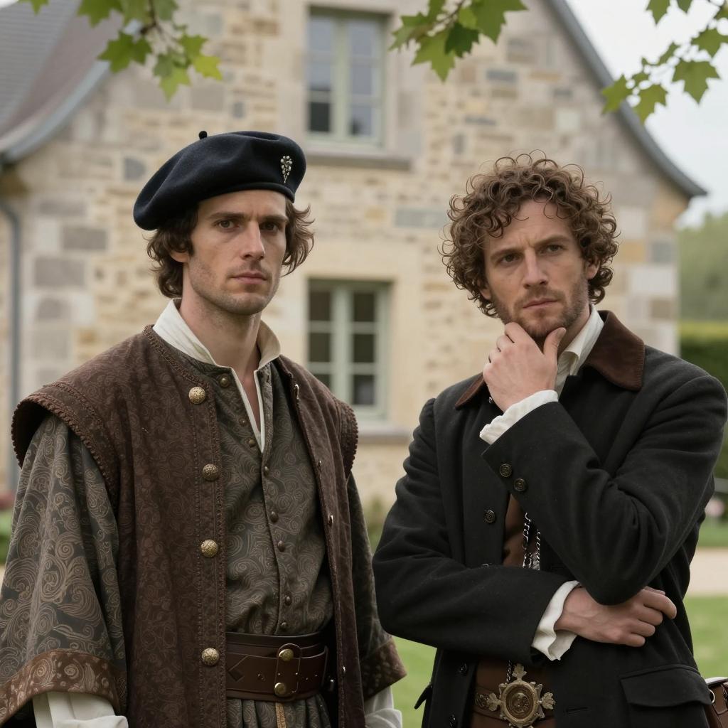 Two men sit on a bench in front of empty bleachers. The man on the left has dark hair, wears a beige shirt with a red scarf, and holds a black tablet. The man on the right has a beard, wears a black tricorne hat, dark coat with gold trim, and tan pants. He looks at the tablet with a serious expression. The man on the left leans forward, engaging with the tablet. The man on the right has his left hand on his knee.