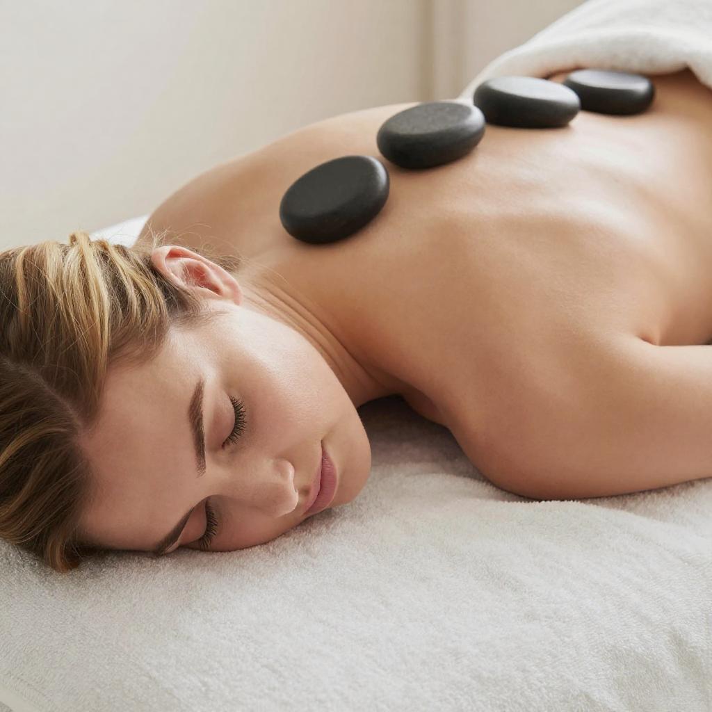 This close-up photo shows a pair of hands, likely male, gently massaging a person's back. The skin is light-toned and the person is partially covered by a white towel. The lighting is soft and even, highlighting the smooth texture of the skin. The camera angle is slightly above, focusing on the hands and back, with a shallow depth of field that keeps the background slightly blurred.