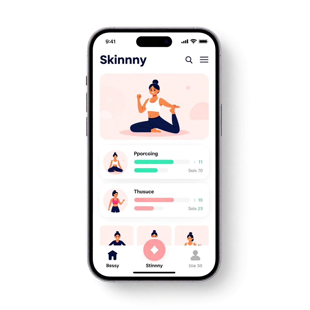 Skinny app free mobile app concept, bright pastel user interface with easy navigation, cute fitness avatars animated on screen, interactive progress bars and charts, visually appealing and inviting, soft shadows and rounded corners style for wellness tracking