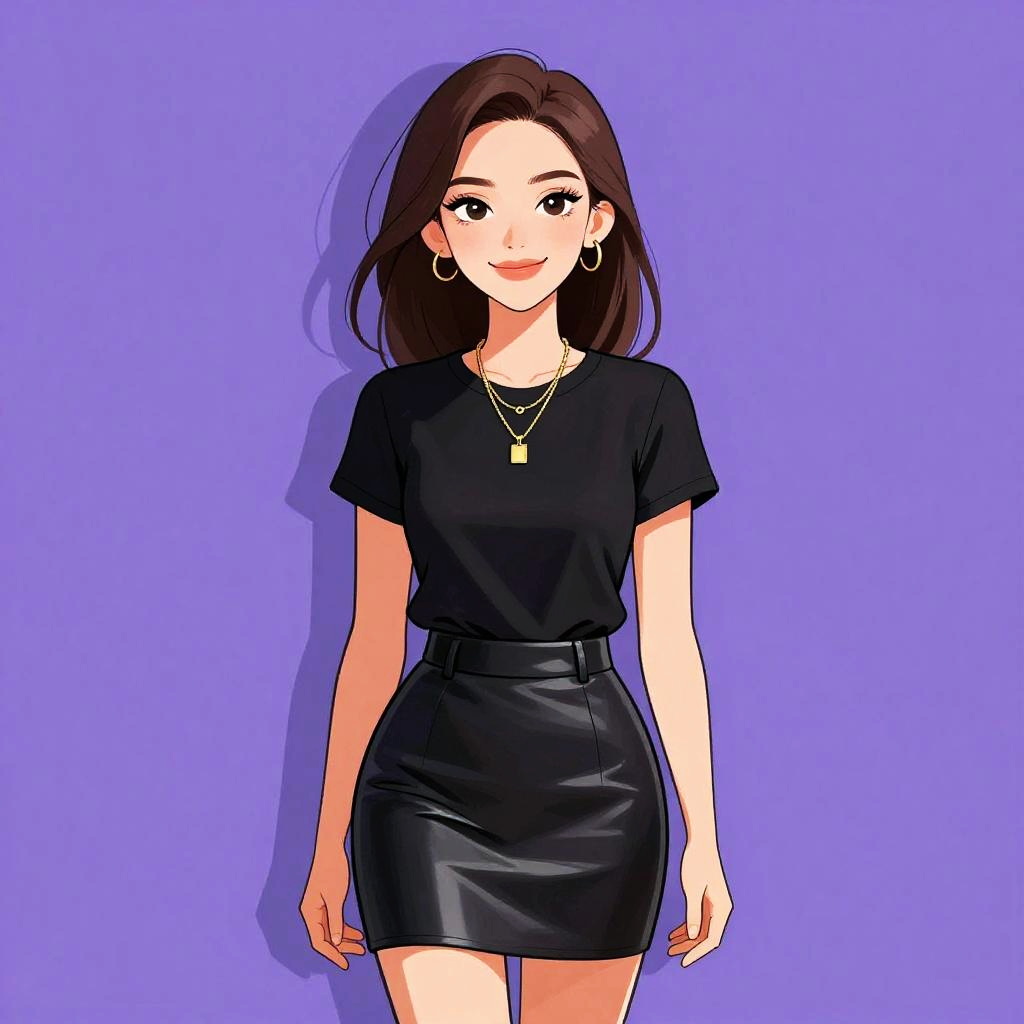 Illustration of a woman with a pretty face and shoulder-length brown hair, wearing a fitted grey polo shirt with a white collar and colorful stripe details on the sleeves, paired with a black faux leather A-line mini skirt and a wide belt with a silver buckle. She is also wearing chunky black platform sandals. The background is a purple square on a white studio backdrop.