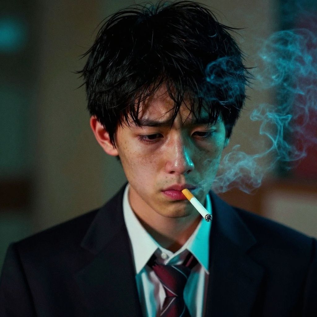 Highly detailed, high budget, OverallDetail, Compose a story inspired by a photo featuring an enchanting boy with messy bedhead black hair, business suit, sad, skinny, (depressed, tired, uncomfortable:1.5), pale, caucasian, (half asian:0.4), smoking cigarette, natural colored, color graded cinematic, awash in colorful shades, conjuring a brightly colored, mysteriously glowing, darkness, atmospheric lighting, natural, eye catchlights, atmospheric haze, Film grain, shallow depth of field, cinemascope, moody, epic, shallow dof, RAW photo, photorealistic, candid camera, imperfections, cinematic film still, throughout the frame, hkmagic, Closeup Portrait, closeup