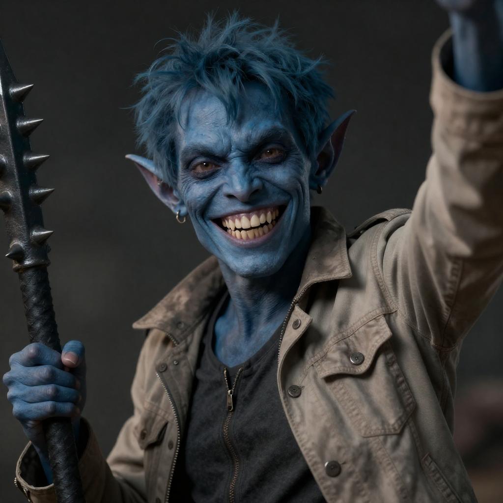 Blue-skinned demon with short, messy hair, sharp teeth, and pointy ears, smiling broadly. Holding a black, spiked weapon in left hand, raising right arm. Wearing a dirty, beige jacket. Dark, muted background. Close-up, upper body shot.