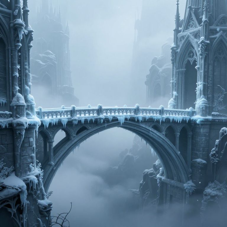 A hauntingly ethereal 3D-rendered bridge, crafted from icy stone and suspended between towering, gothic-style structures, evokes a sense of otherworldly mystery, with its frozen arches and misty surroundings creating a dramatic, atmospheric scene reminiscent of a fantasy illustration where time seems to flow backward, each step dissolving into the past.