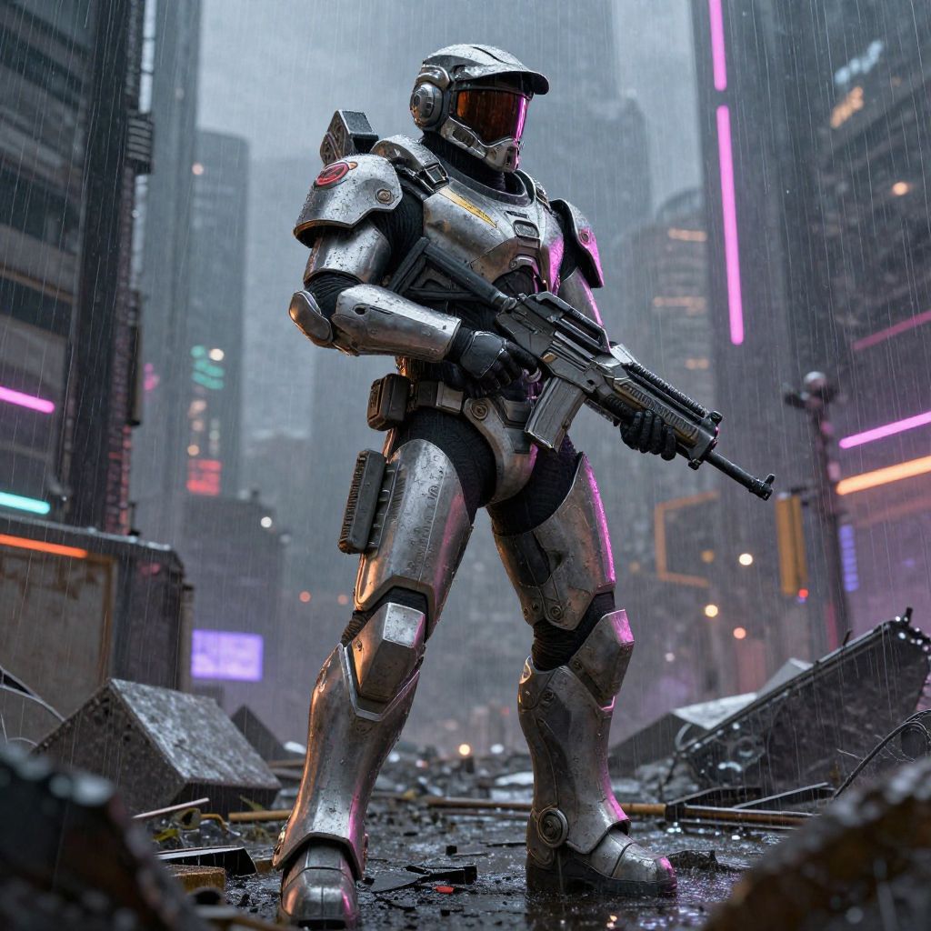 Cyberpunk sci-fi soldier in shiny silver armor, holding a rifle, standing in a rain-soaked, neon-lit, ruined city street.
