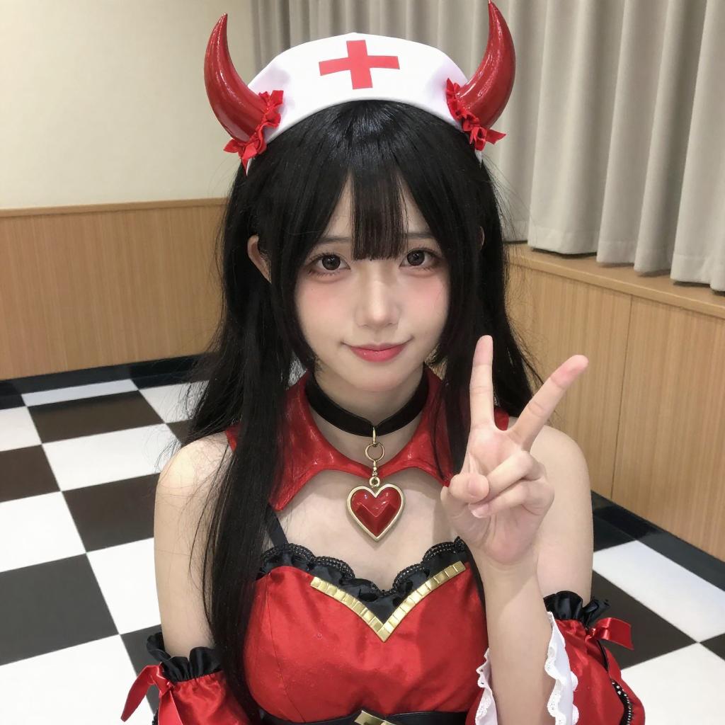 Photograph of an Asian woman with long black hair, wearing a red and black cosplay outfit with devil horns, a white and red hat, and a black choker with a heart-shaped pendant. She makes a peace sign with her right hand, smiling with pink lipstick. Background includes a checkered floor, a wooden cabinet, and a beige curtain.