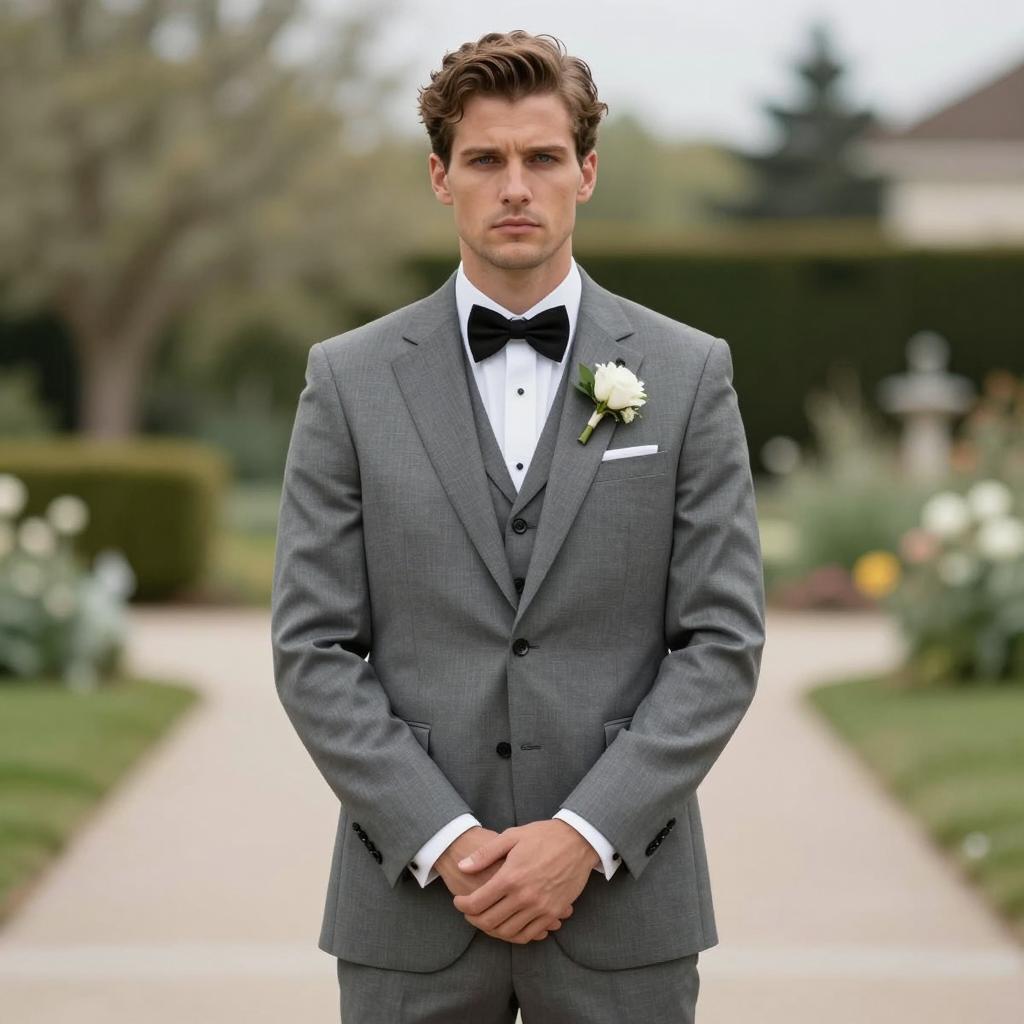 Man rehearsal dinner outfit, photograph of handsome young man, short brown hair, clean-cut, wearing gray suit, white shirt, maroon tie, maroon pocket square, serious expression, blurred background with warm lighting, candles, floral arrangements, upscale setting, portrait orientation, professional lighting, formal attire, medium close-up, realistic style, high quality, elegant, stylish, sharp focus on subject, soft focus background