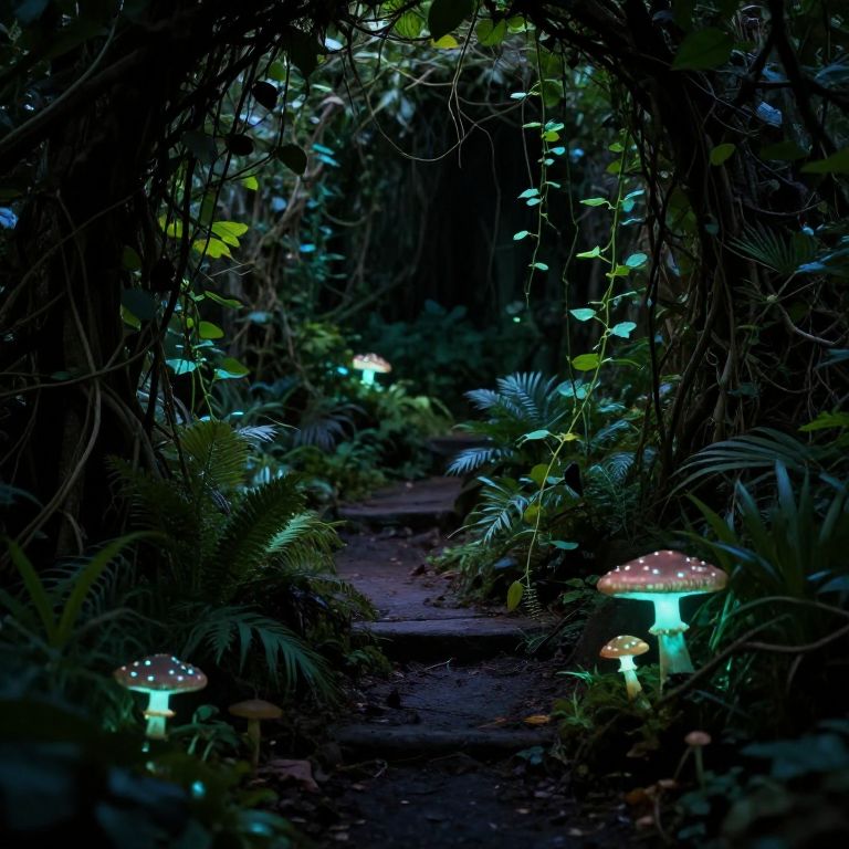 A dark garden background featuring overgrown vines, mysterious glowing mushrooms, and shadowy pathways winding through dense foliage, illuminated by subtle bioluminescent plants, evoking a sense of hidden magic and quiet suspense.