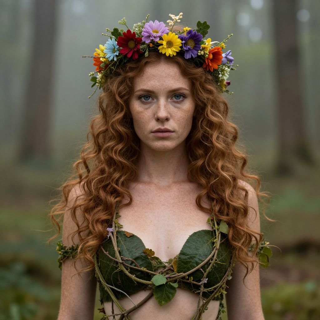 Photograph of a woman with large breasts, brown hair, wearing a leafy headpiece and green, vine-adorned outfit in a misty