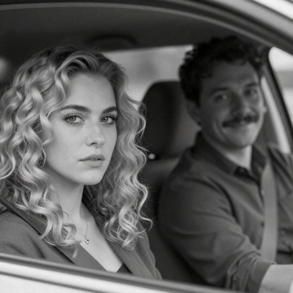Black and white photograph of a man and woman in a car. Woman with curly blonde hair, intense gaze, left side. Man with short dark hair, mustache, smiling, right side, steering wheel in front. Car interior background.