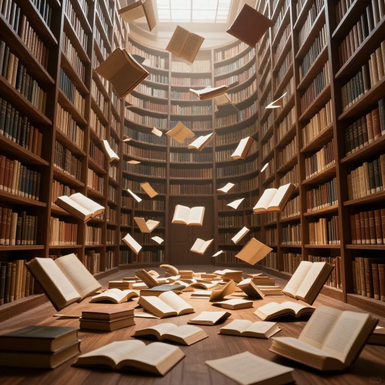Photograph of a circular library with floating books, open pages suspended mid-air, and wooden shelves filled with books surrounding. Warm, lit atmosphere.
