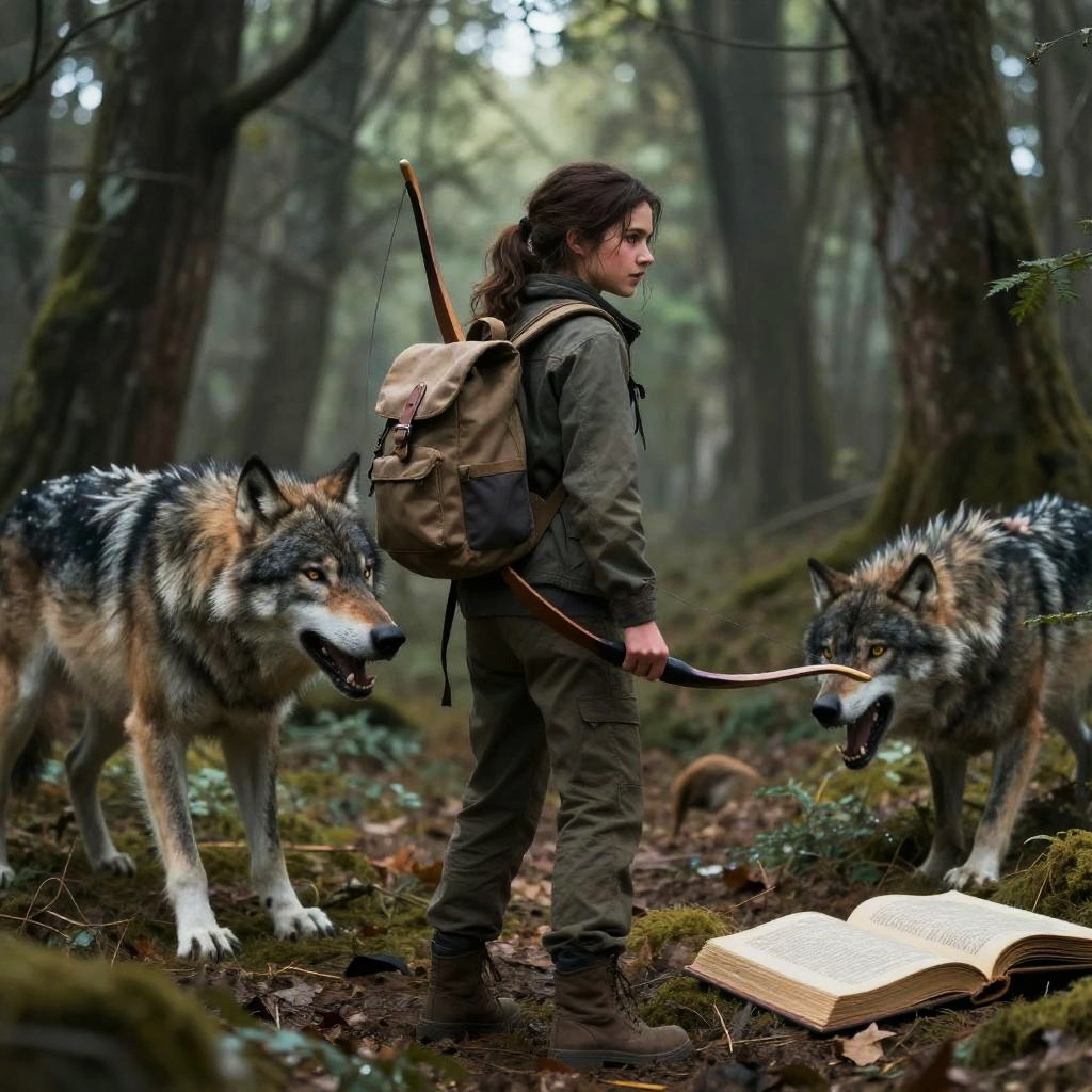 Realistic photo.Ellie stands full height with the backpack and the bow from the TV series The Last of Us defending from a ferocious wolf in book fairy-tale illustrations by Ivan Bilibin. realistic photo