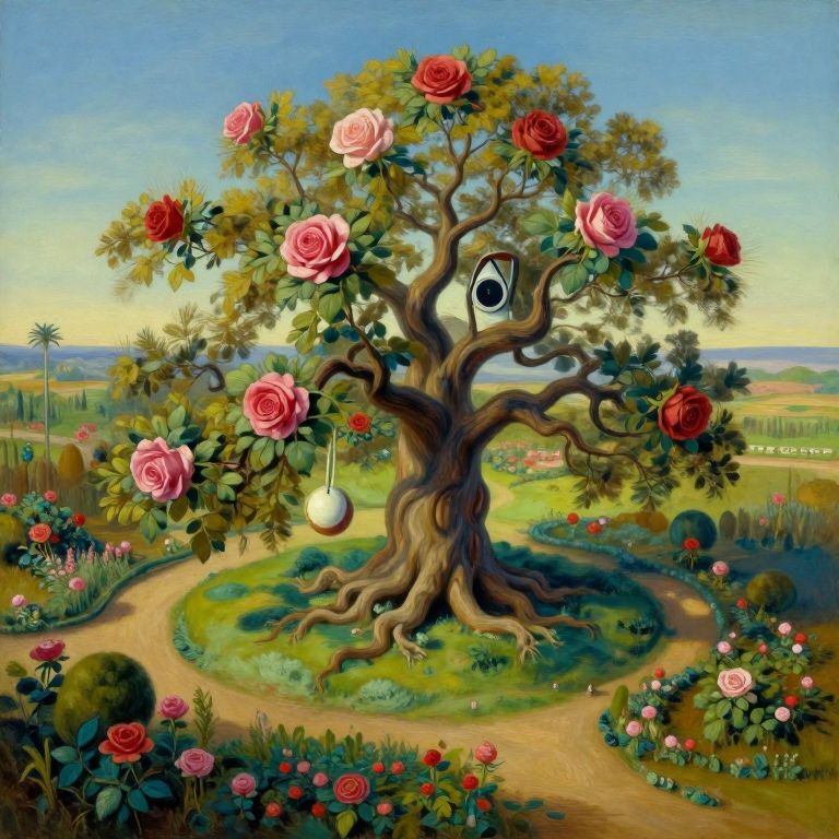 A surreal oil painting captures an aerial view of an enchanting garden landscape, embodying Dali-esque whimsy. A grand oak tree reaches towards the sky, its twisted branches adorned with oversized roses that seem to dance in an invisible wind. Housed within the foliage is a peculiar tower, its pendulum swinging at a languid pace, as if time itself has been distorted in this captivating realm. The serene scene evokes both tranquility and curiosity, beckoning viewers to contemplate the mystical forces at work within this dreamlike portrayal of nature's beauty.