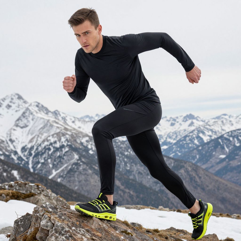 A man, athletic long-sleeve base layer, fitted running tights, cushioned cross-training shoes, black and neon yellow palette, snow-dusted peaks, dynamic composition, focused expression Man has masculine face and piercing eyes