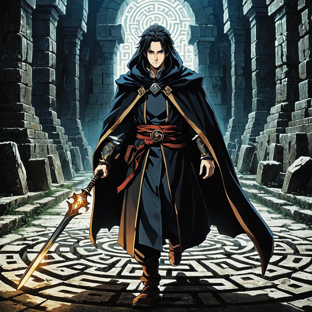 A cunning rogue, with sharp amber eyes and a cloak woven from shadows, tracing a complex Nen spell, in a labyrinth of ancient ruins haunted by magic, depicted in the action-packed and psychological anime style of Yoshihiro Togashi.