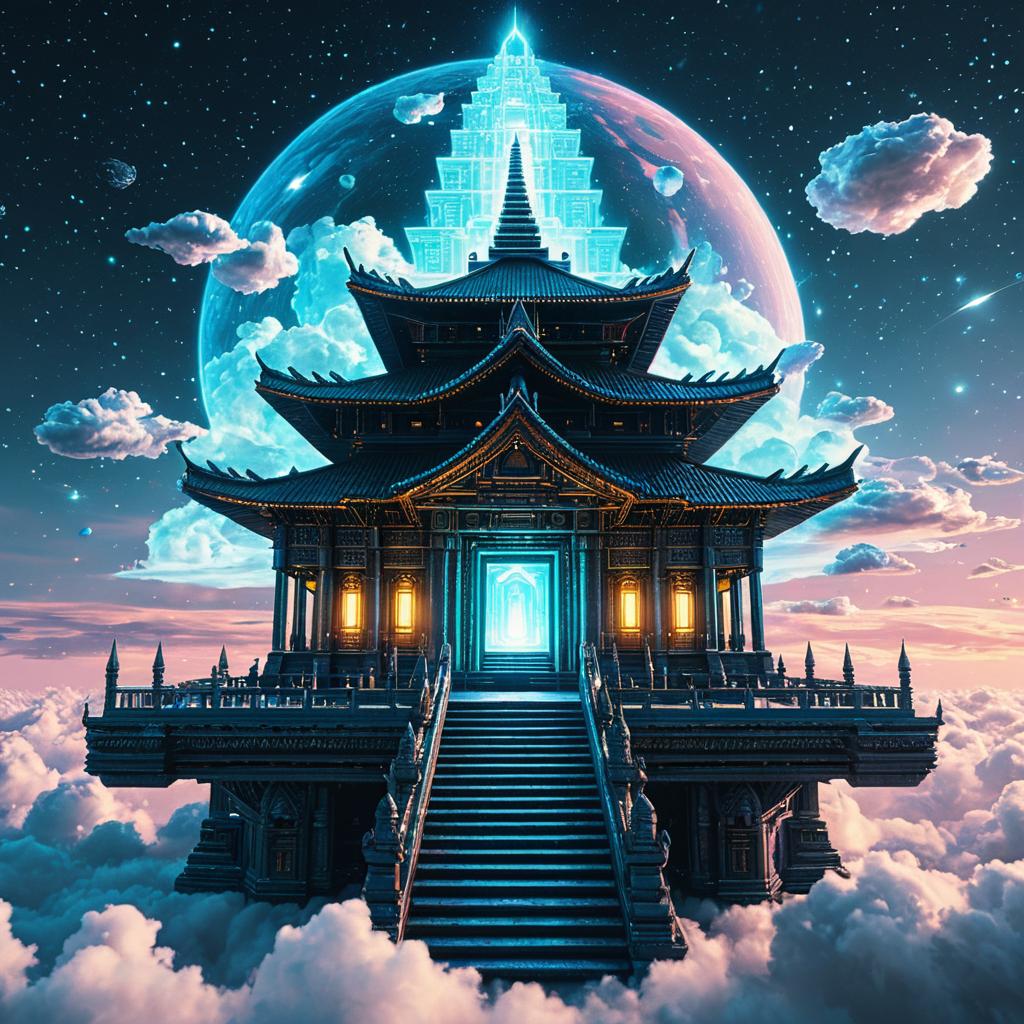 Highly detailed holographic art of a floating temple with a glowing staircase to the house, suspended in a holographic sky, hologram clouds drifting around, sci-fi, 3D, highly detailed, octane render